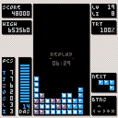 I really learned a lot while making this, trying to overcome difficulties and studying how NES Tetris is working. In the current state, I'm confident the game is pretty much done, with just a handful of (really minor) bugs, and I know it because it's been in this state for at least two months, but I always played the game instead of completing the final touches needed for submitting it. That, in my book, is a good sign of a game that works.